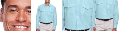 3.5 oz./yd²/115 gsm (US), 5.8 oz./L yd (CA), 100% polyester ripstop Polyester mesh lining in upper back Moisture-wicking performance UPF 40+ protection Anti-microbial properties Structured collar with integrated collar stays Chest pocket with pen slots and pocket flaps Full-button front Back venting for breathability