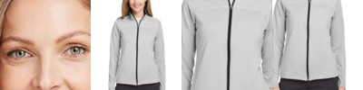 Reflective tab with drop logo folded over left sleeve hem and attached with two bright green bartacks above side splits