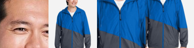 - Inside placket; roll-away hood; adjustable cuffs with tabs